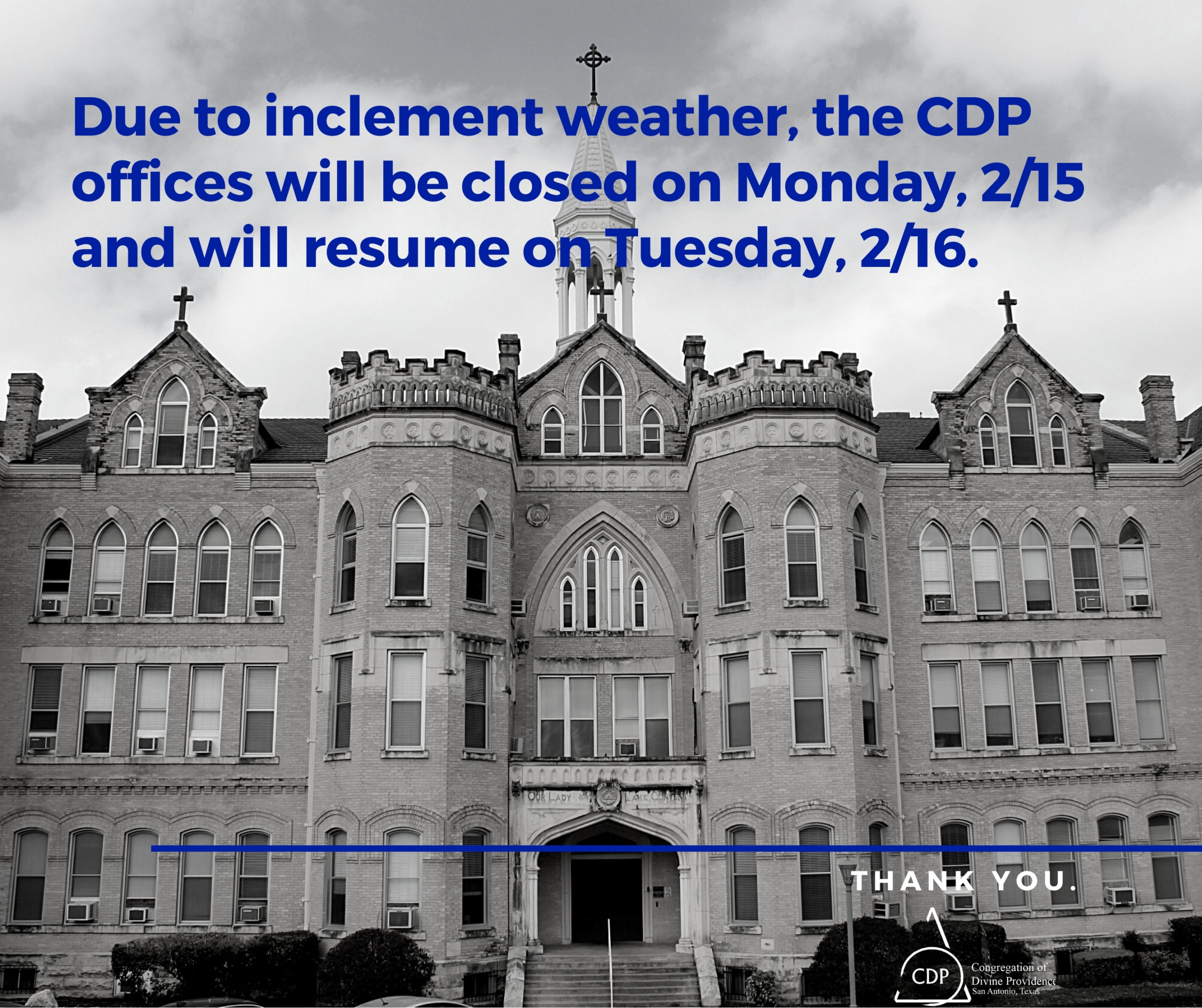 Due to inclement weather forecasted for Monday, February 15, Congregation of Divine Providence offices will be closed Please click here for more information.