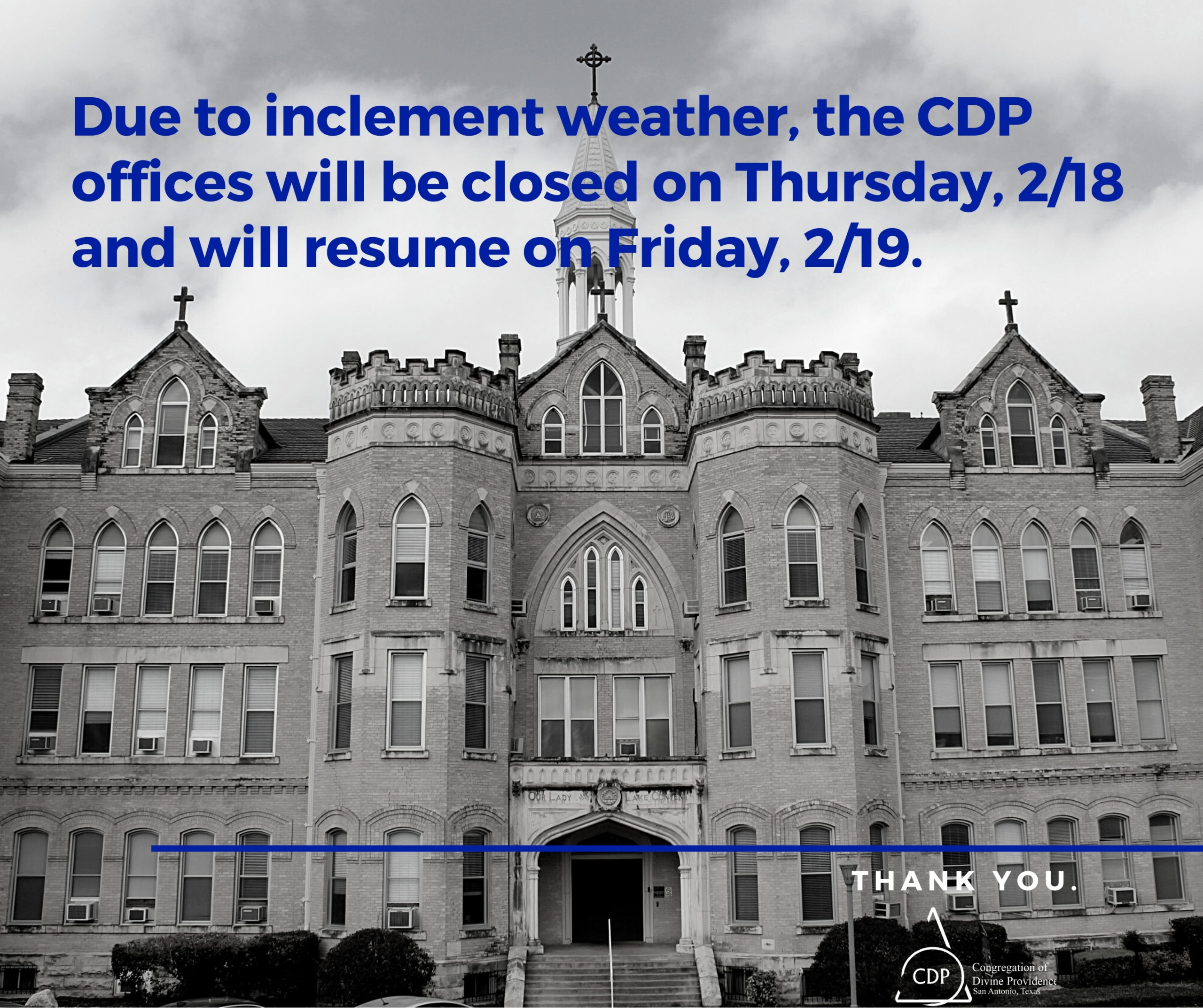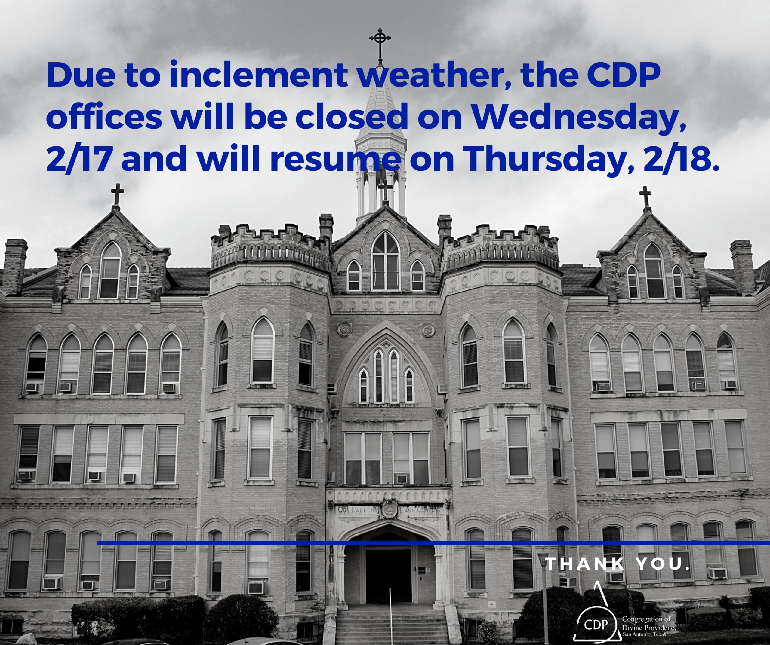 Due to inclement weather forecasted for Thursday, February 18, Congregation of Divine Providence offices will be closed. Please click here for more information.