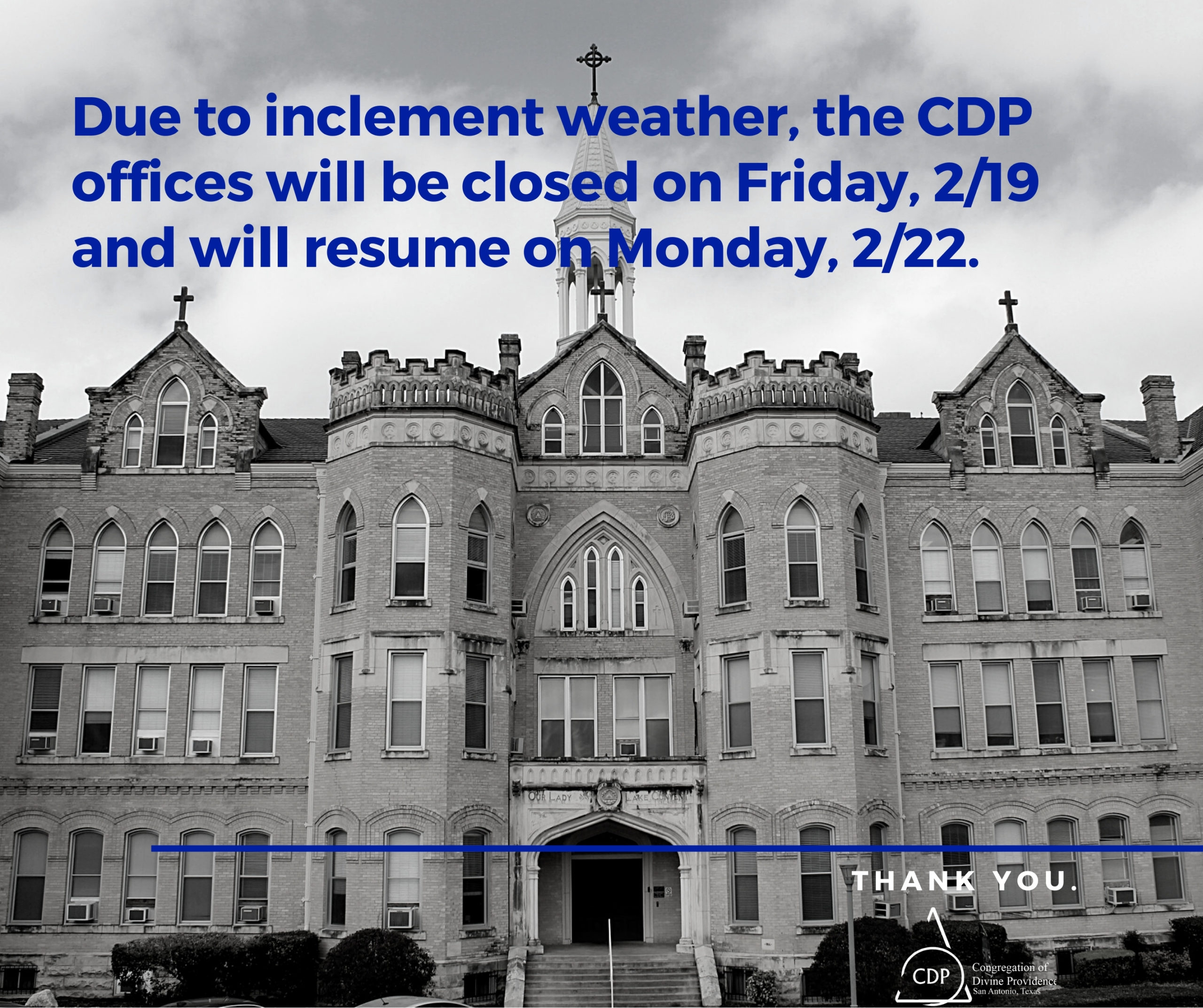 Due to inclement weather forecasted for Friday, February 19, Congregation of Divine Providence offices will be closed. Please click here for more information.