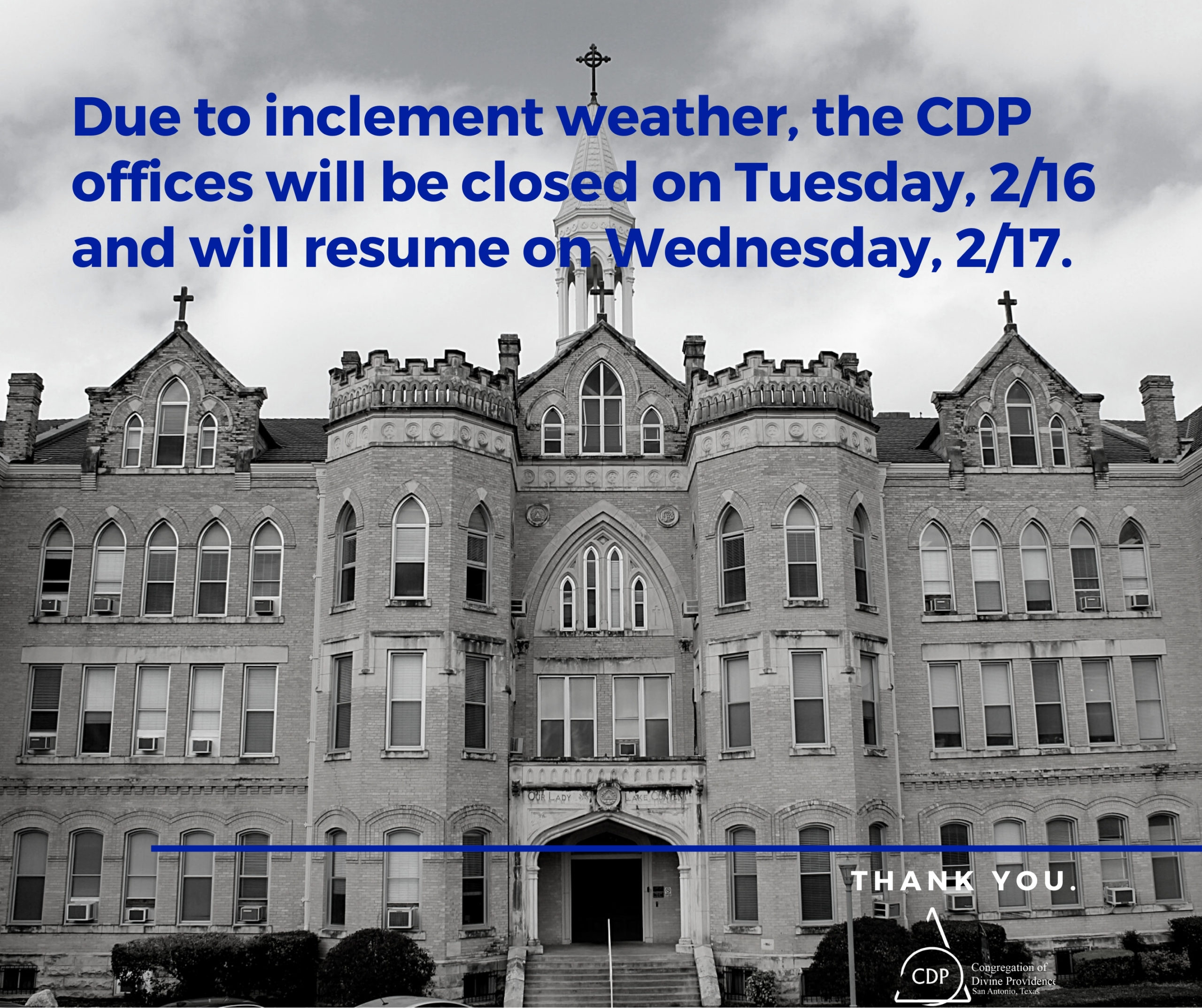 Due to inclement weather forecasted for Tuesday, February 16, Congregation of Divine Providence offices will be closed. Please click here for more information.